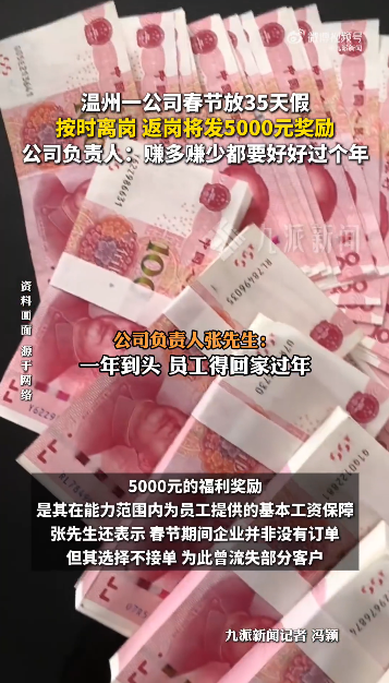 浙江一公司春节放35天假,按时离岗返岗奖5000元,负责人回应